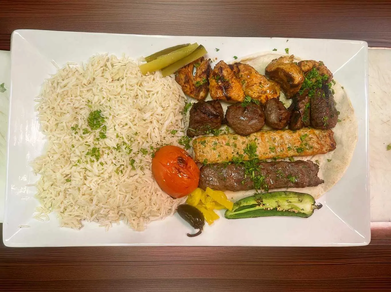 One Skewer Of Chicken Kabob, Beef Kabab, Chicken Kofta, And Kofta Kabab All Served Over A Bed Of Rice. Served With Side Salad