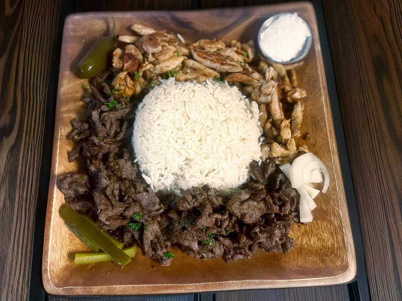 Beef And Chicken Shawarma Served Over A Bed Of Rice. Served With Side Salad