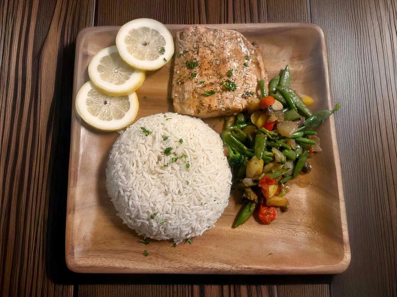 Pan Seared Salmon, Served With Veggies, On A Bed Of Rice, And Side Salad